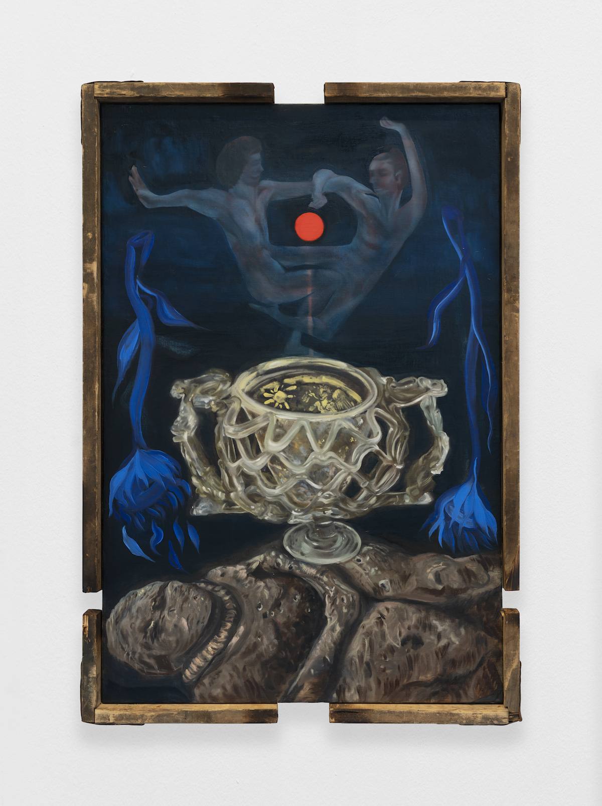 Dichronic Glass, Dithyrambic Sun (2024) Oil on linen in singed wooden bread basket, 54.5 x 80.5 cm