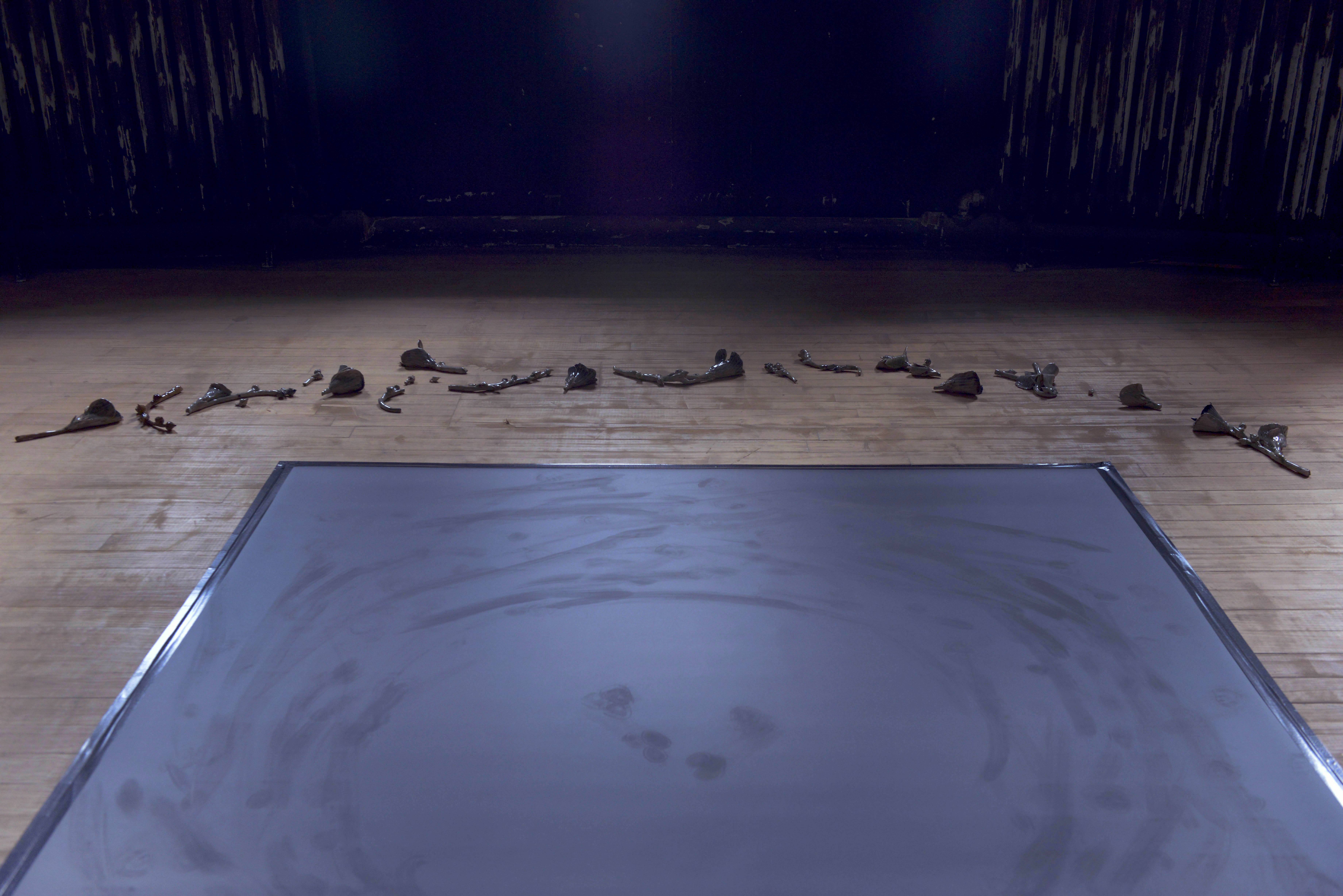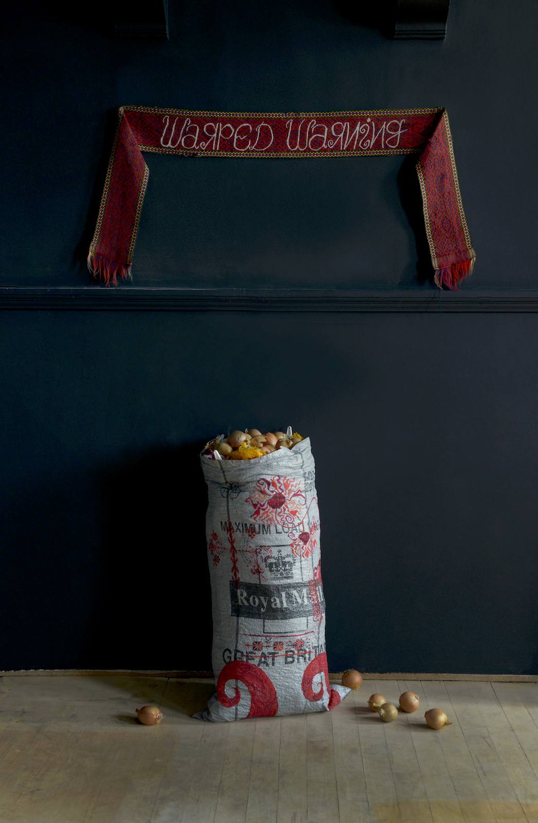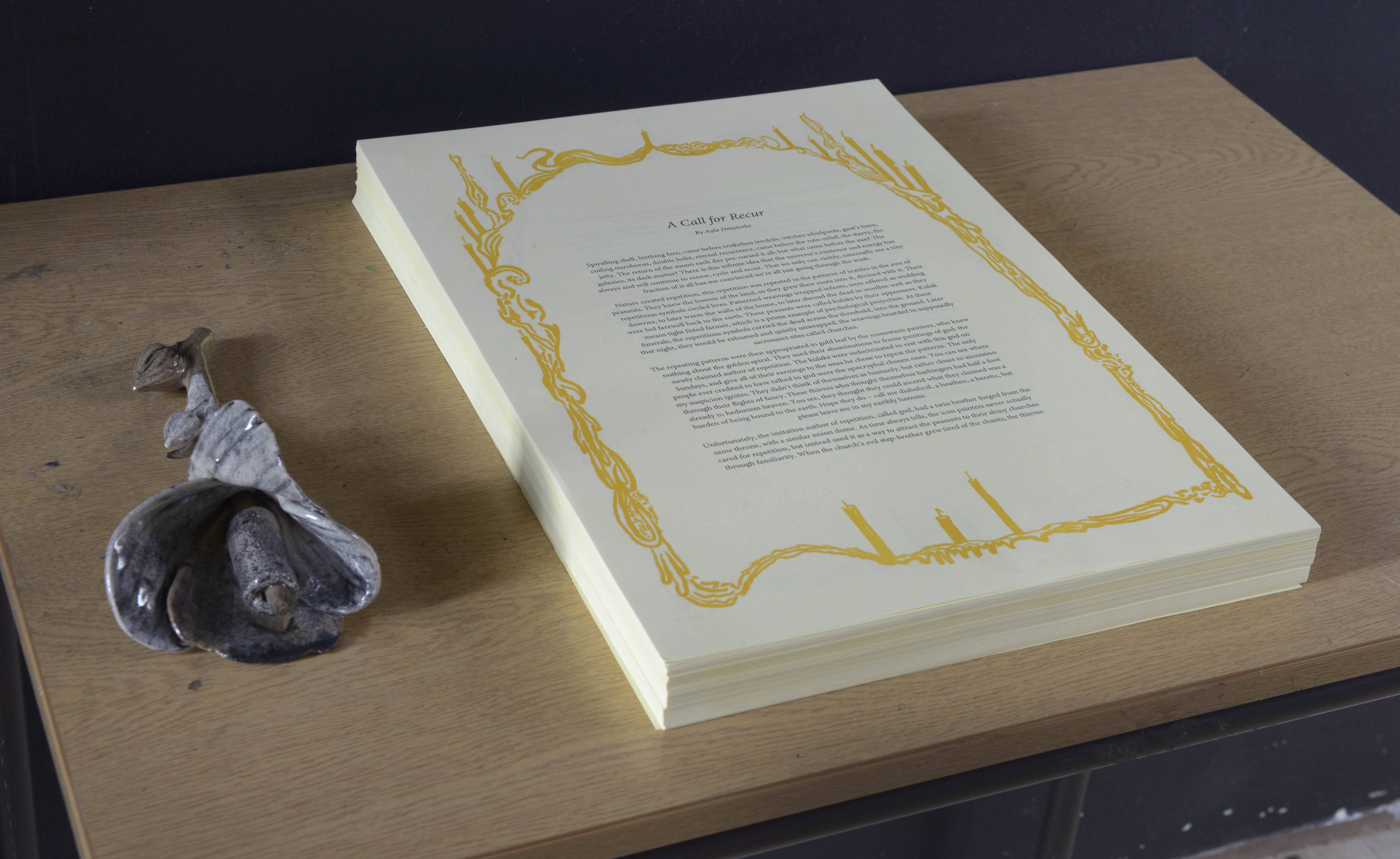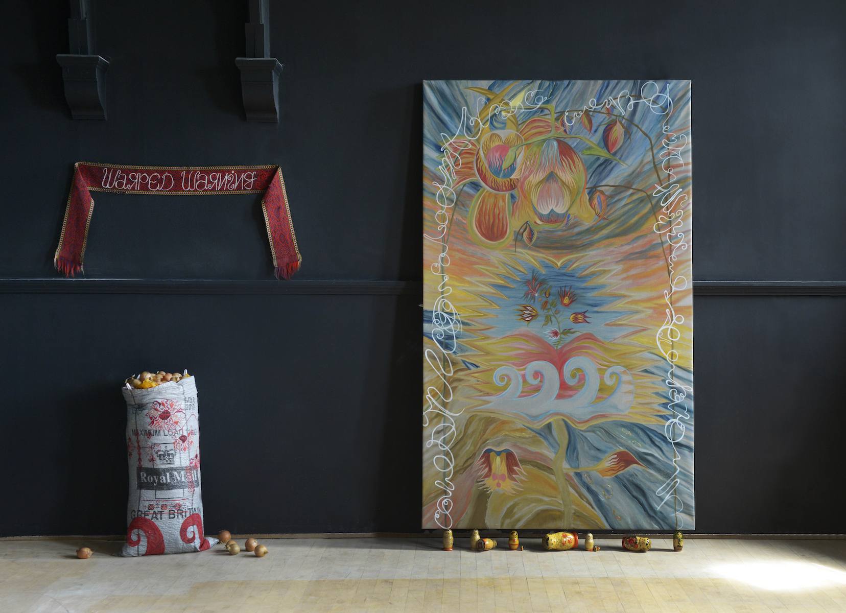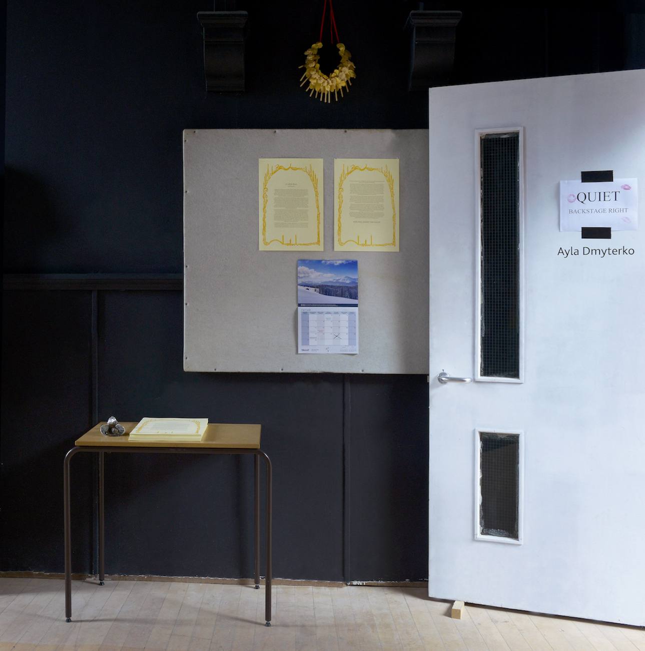 Waiting in a darkened, curved room behind ceiling-high velvet curtains are oil paintings on raw linen embodying symbols' past. Liberated from the archive, they relevé in a balancing act atop USSR-era matryoshka. Slipper dust encircles a vinyl dance mat, stoneware hollyhocks that crackle in applause to a ticking metronome, x-stitches thread cross-century regalia, a woven polypropylene royal mail sac overflows with onions and a para-fictional text titled A Call for Recur printed by Sunday's Print is offered beneath a Cyrillic calendar marking 04.24.22 beneath a diffused wax wreath. This bricolage articulates tensions rising since 2014, idle time spent, anxieties that lie in complicity, and the warping of perspectives moments before the curtains rise…